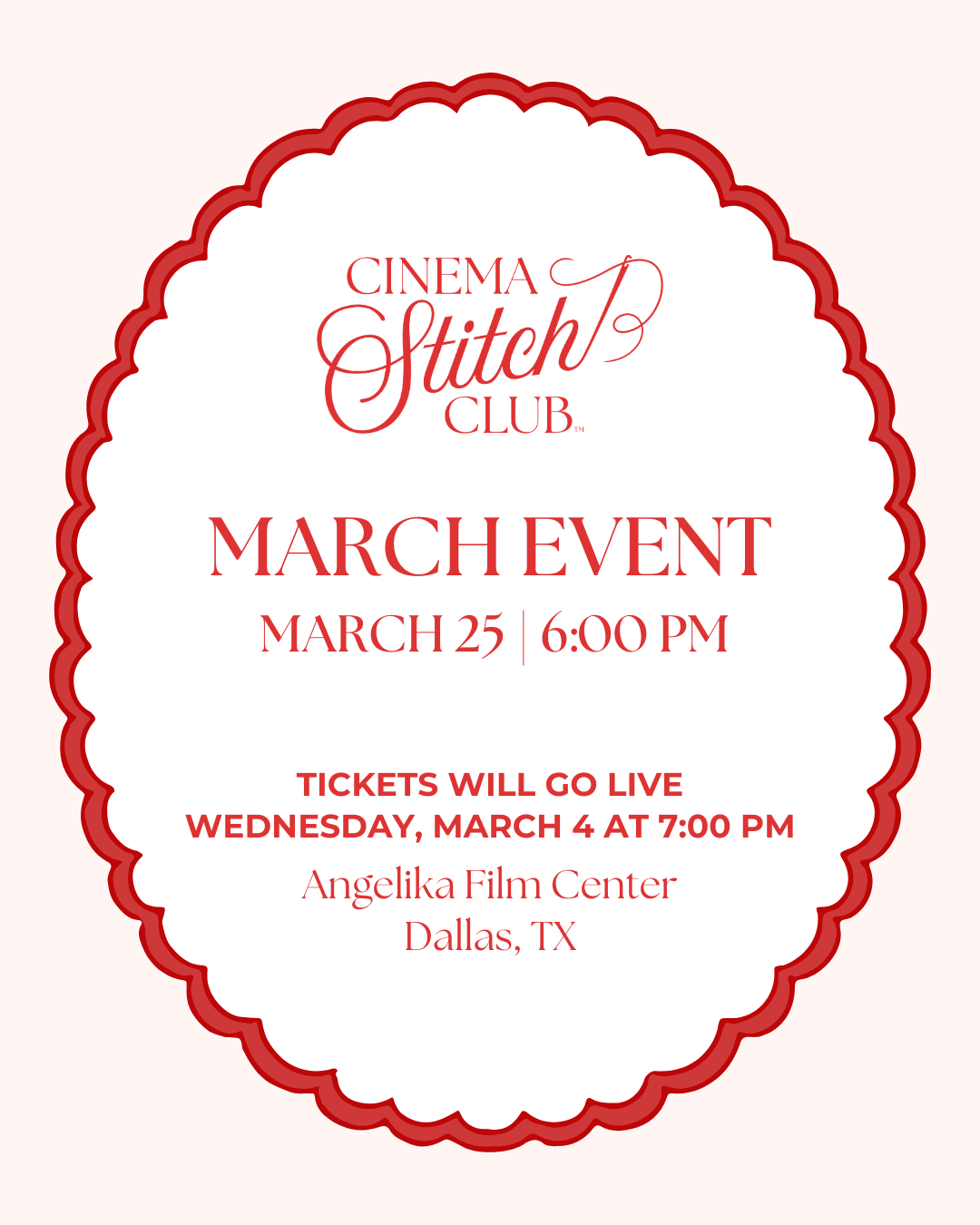 Join us for our March Cinema Stitch Club on March 25, at 6:00 pm! Tickets go on sale March 4, at 7:00 pm!